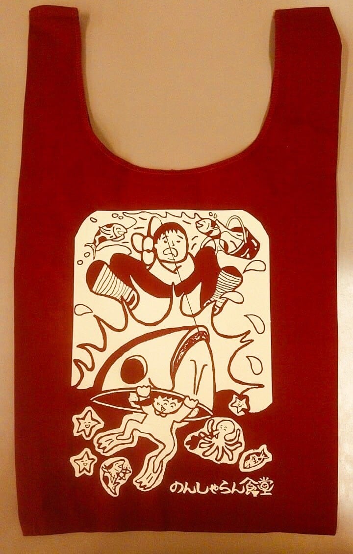 府中市場で愛されるまぐろ丼とカレーの店「のんしゃらん食堂」スタッフによるオリジナルイラストがエコバッグになりました!